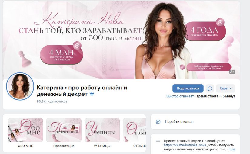 Катерина пишет: «Привет! Ставь быстрее + в сообщения https://vk.me/katrinka_nova , чтобы получить видео и пошаговую инструкцию о том, как ты можешь зарабатывать онлайн и выйти на доход от 100тыс уже в первый месяц!»