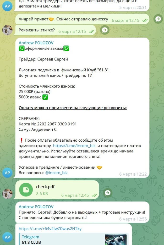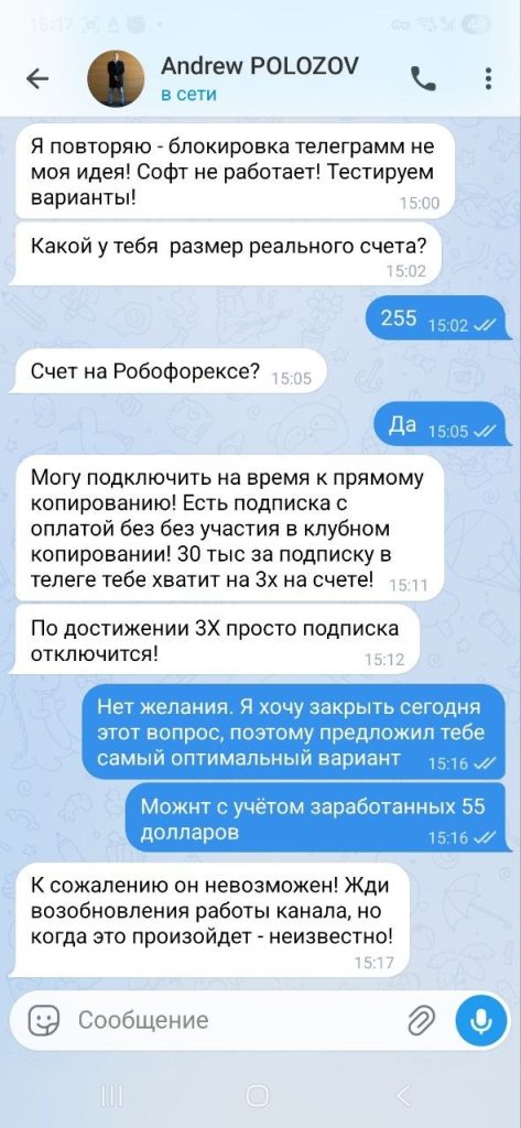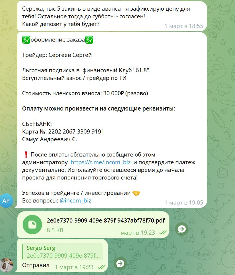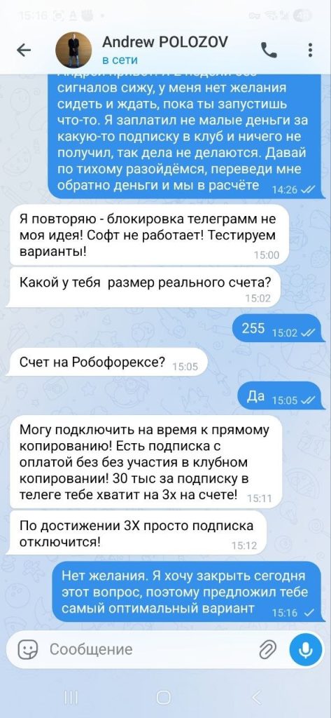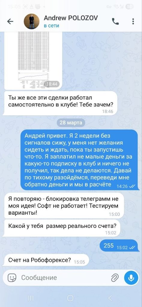 Я столкнулся с мошенником, купил подписку в закрытый клуб. Условия для вступления были следующие: Разовая оплата за вступление в клуб 30000 рублей + ежемесячная плата 5000 рублей. Клуб проработал чуть больше 1 недели, после этого пошли технические проблемы и сигналы перестали публиковать. Ждал 2 недели, полная тишина. Я потребовал возврата денежных средств, на что данный персонаж дал мне понять, что он не собирается возвращать деньги. Этот персонаж занёс меня в блок и почистил всю нашу переписку, все cкрины и доказательства я заранее успел сохранить.