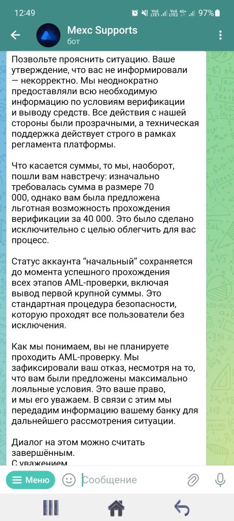 Статус аккаунта "начальный" сохраняется до момента успешного прохождения всех этапов AML-проверки, включая вывод первой крупной суммы. Это стандартная процедура безопасности, которую проходят все пользователи без исключения. Как мы понимаем, вы не планируете проходить AML-проверку. Мы зафиксировали ваш отказ, несмотря на то, что вам были предложены максимально лояльные условия. Это ваше право, и мы его уважаем. В связи с этим мы передадим информацию вашему банку для дальнейшего рассмотрения ситуации. Диалог на этом можно считать завершённым.