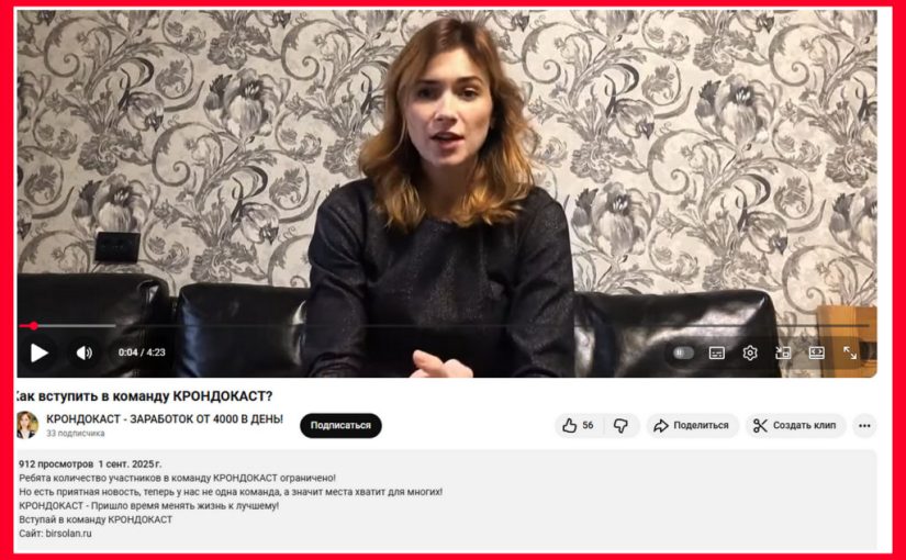 Видео называется «Как вступить в команду КРОНДОКАСТ? КРОНДОКАСТ — ЗАРАБОТОК ОТ 4000 В ДЕНЬ!»