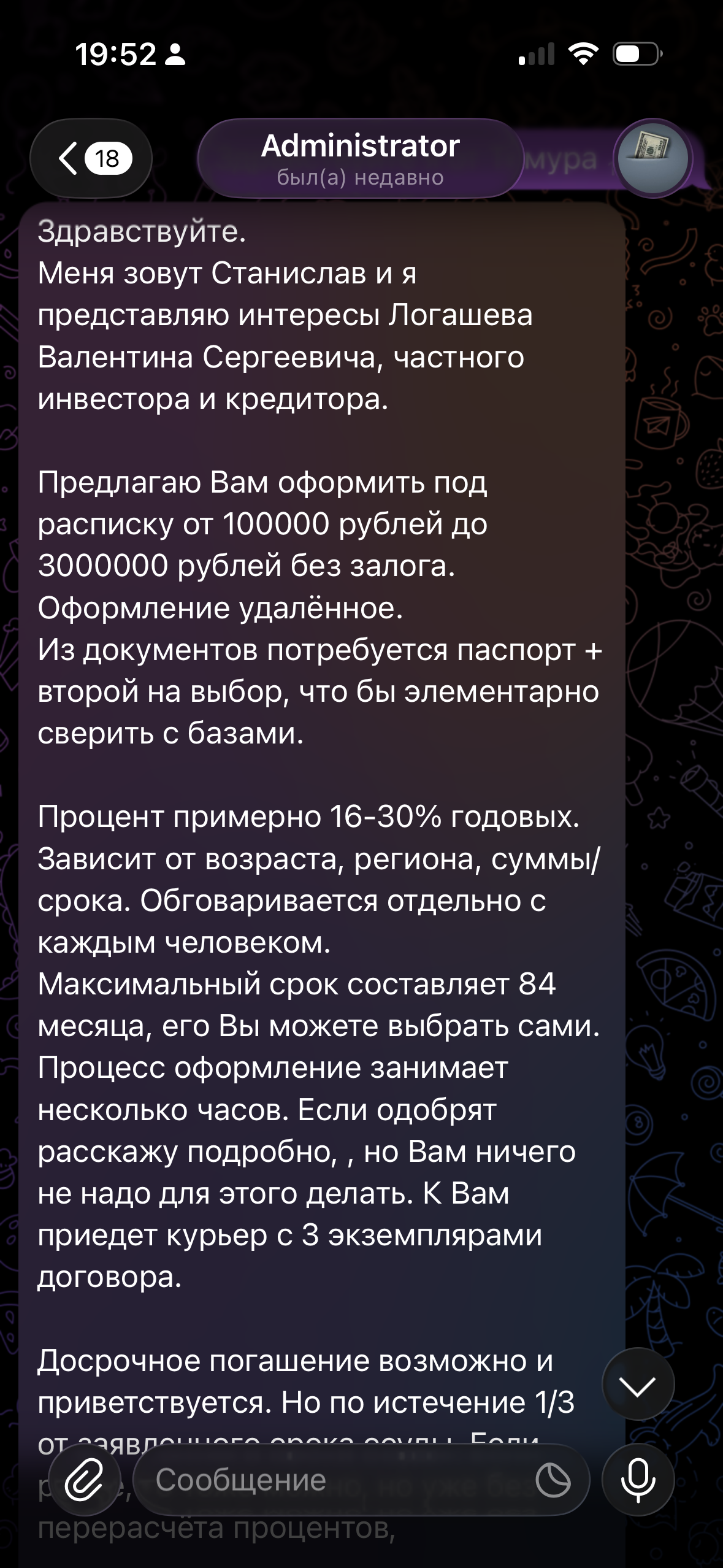 Меня зовут Станислав и я представляю интересы Логашева Валентина Сергеевича, частного инвестора и кредитора.