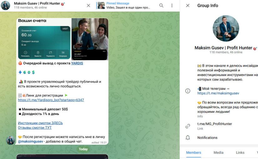 Некто Максим Гусев заманивает в пирамиду Ярдис, где обещают 1 процент в день. Его чат называется Maksim Gusev | Profit Hunter (@MG_ProfitHunter).