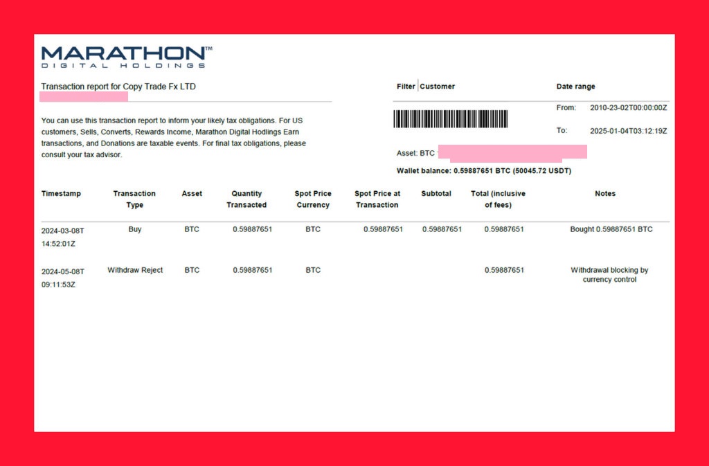 Занимаюсь возвратом средств при посредничестве INTERNATIONAL LEGAL COLLEGE. Читал отзывы. У меня другая видимо схема. Сразу оговаривал, что ничего отправлять никуда не буду. Нашли мои средства в крупной компании американской по майнингу Marathon Digital Hodlings. Средства заблокированы при выводе еще в августе 2024 года. Юристам пришел отчет, который мне отправили. Я писал письма в эту компанию, чтоб удостовериться в подлинности отчета. Ответа нет.