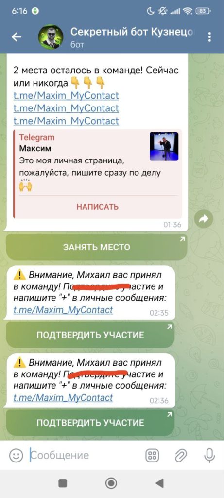 Ещё интереснее то, что его бот не знает как зовут этого Максима На скриншоте видно, что он Михаил, по мнению бота, а не Максим. Ещё, якобы, в команду принял, хотя я там ни слова не написал нигде.