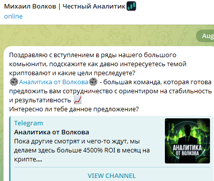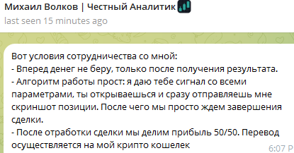 Мошенник из Казахстана, именует себя «Михаил Волков | честный аналитик». Кидает разными способами: тут и сигналы, которые не работают, прогнозы, рыночная аналитика и т.д. Меня развел на бирже МЕХС, пользуясь неопытностью новичка. Схемы разные, результат один. Не ведитесь!