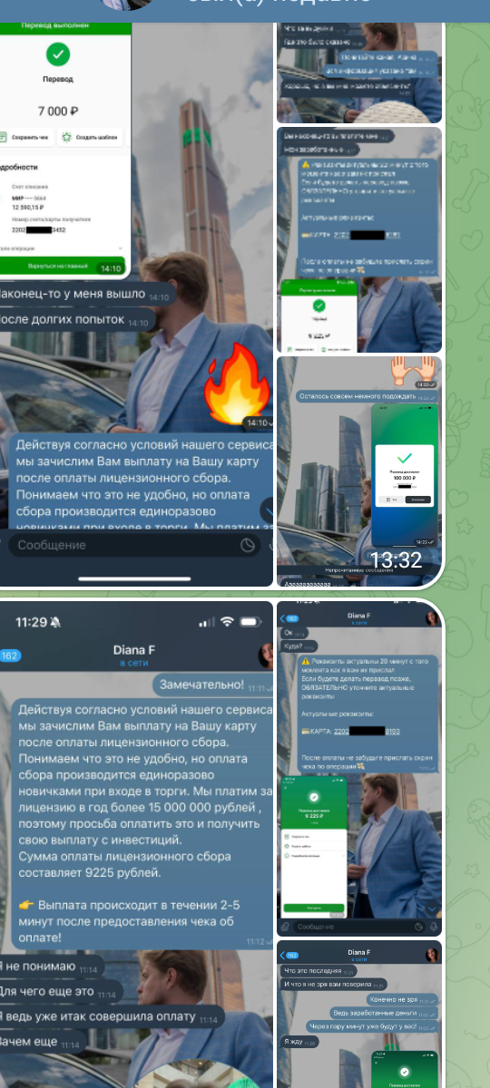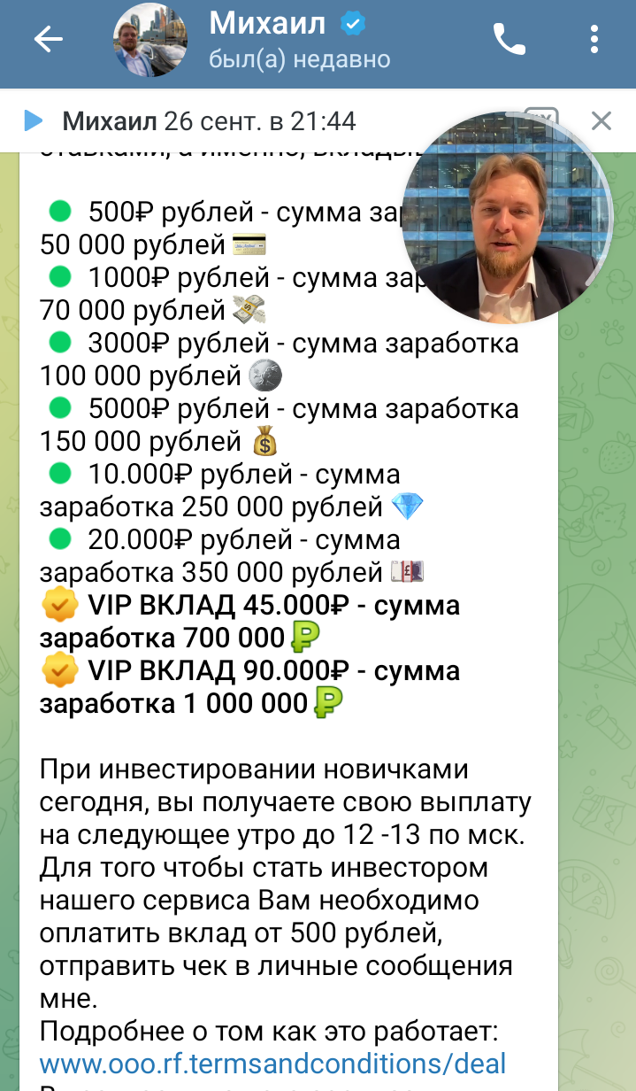 Активно ежедневно в телеграмм предлагает заработок миллионы, обманывает и вымогает деньги, сначала 5 тыс страховому агенту, 6500 р 13 % налог дура перевела, теперь 9255р инвестиционный сбор , сейчас свой чат назвал Первый заработок.