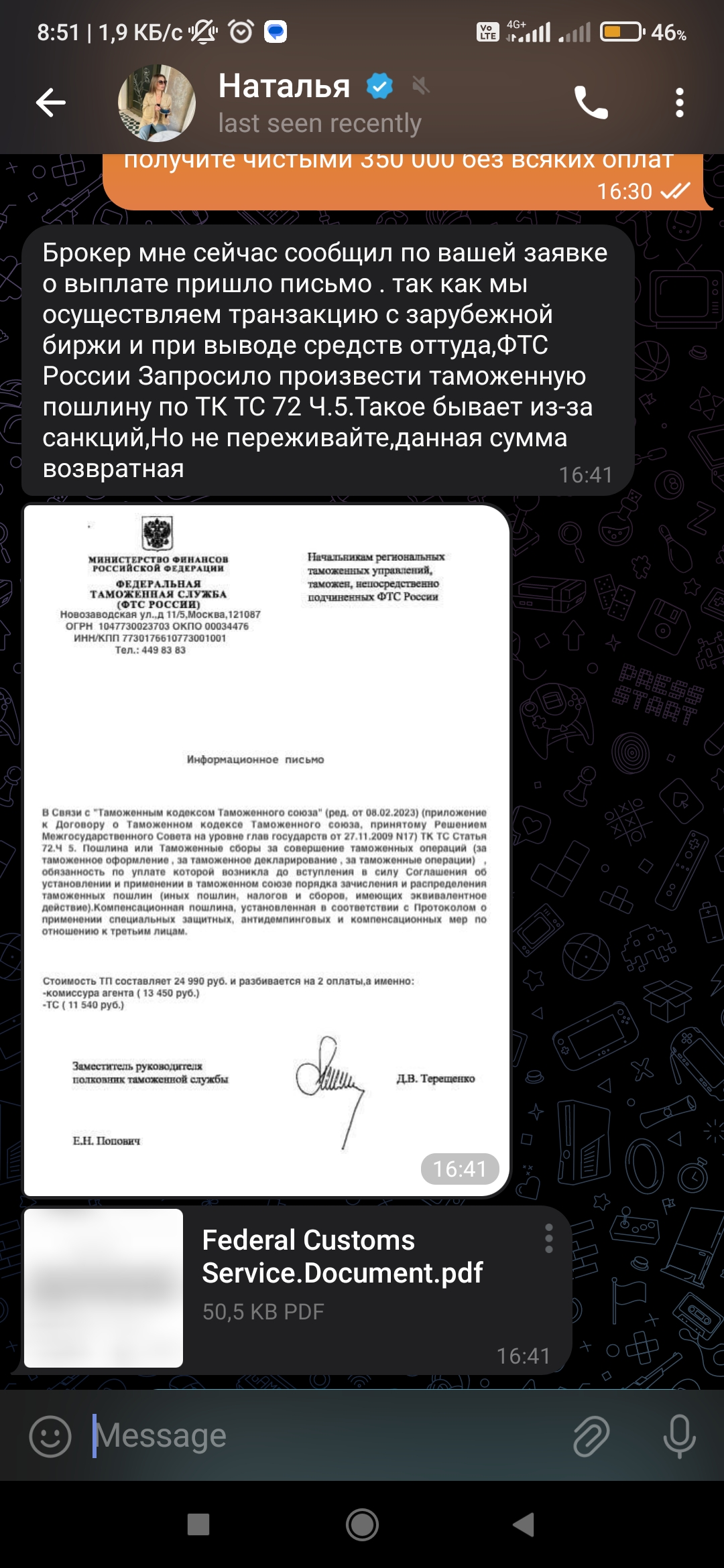 Ну ток после выйгрыша попëрло : оплати лицензию и сразу выводим; оплати брокерский и сразу выводим ; оплати верификацию и выводим ; оплати конвертацию в валюту и выводим ; оплати пошлину и выводим ; а после ещë и присылает письмо типо от ФТС Росси , где нужно ещë оплатить то документ полная подделка . . Зовут еë Наталья. Жаль какоя я дурак что перевëл ей 60 000рублей….. Большая ошибка..
