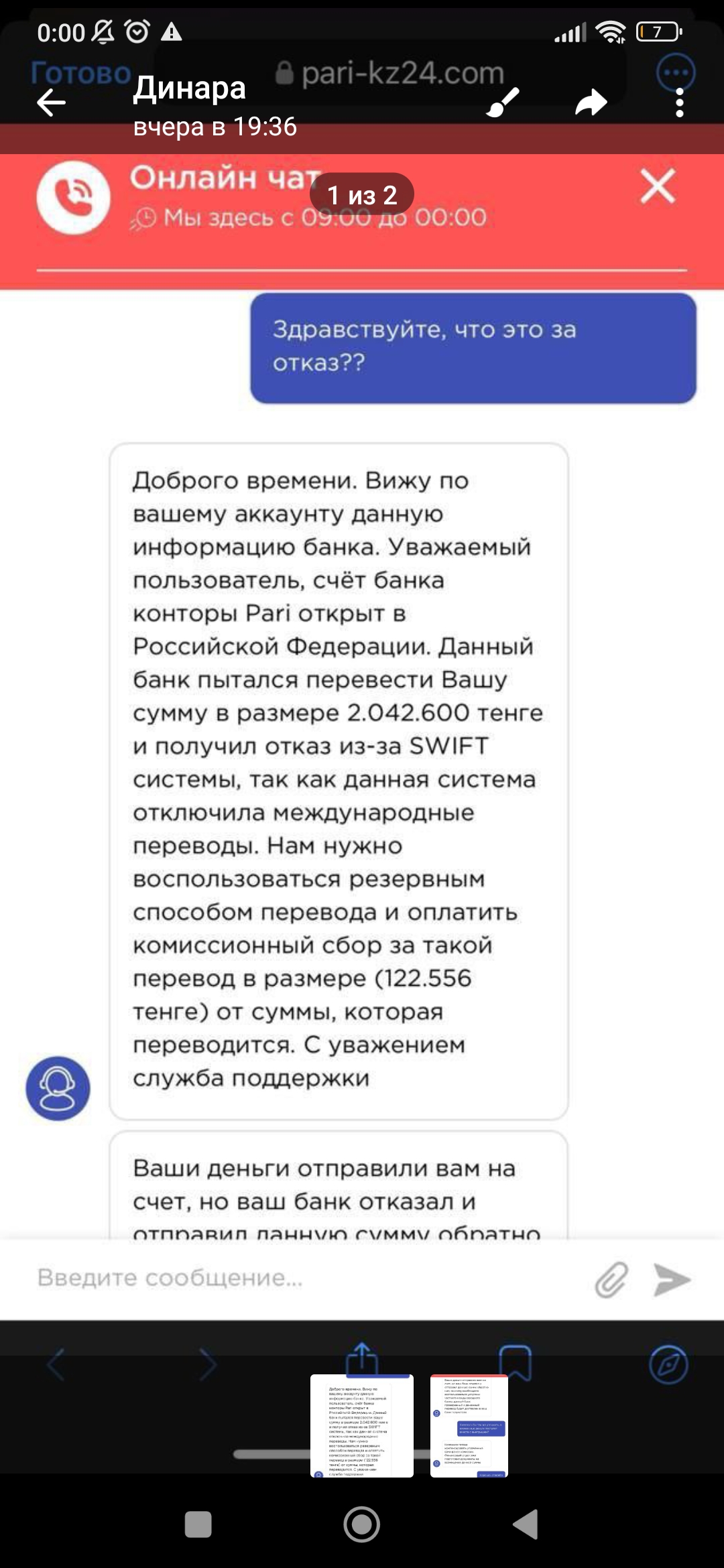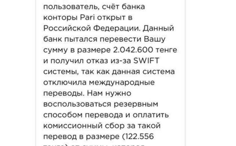 Доброго времени. Вижу по вашему аккаунту данную информацию банка. Уважаемый пользователь, счёт банка конторы Pari открыт в Российской Федерации. Данный банк пытался перевести Вашу сумму в размере 2.042.600 тенге и получил отказ из-за SWIFT системы, так как данная система отключила международные переводы. Нам нужно воспользоваться резервным способом перевода и оплатить комиссионный сбор за такой перевод в размере (122.556 тенге) от суммы, которая переводится. С уважением служба поддержки.
