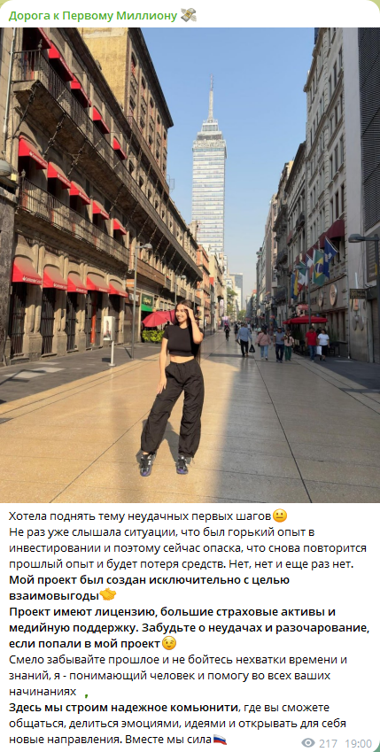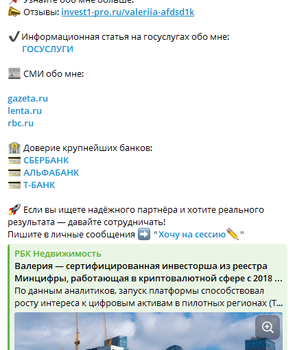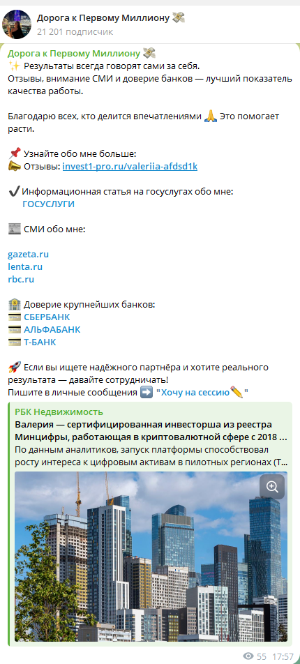 Сейчас Толкачева Валерия Владимировна (или тот кто скрывается за её именем) открыла в Телеграм новый проект «Дорога к первому миллиону» (https://t.me/c/1659646166/7) и продолжает обманывать людей. После первого пробного депозита посыпались требования дополнительных оплат (депозит — 500 рублей (по СБП на телфон +7 901-078-38-59 на Александр Григорьевич Г. — «финанс-аналит.), активация аккаунта — 5000, налог — 6500, верификация — 18500, потом еще что-нибудь придумает). Придумывает новые поборы чтобы не делать выплаты. Делает фейковые отзывы.