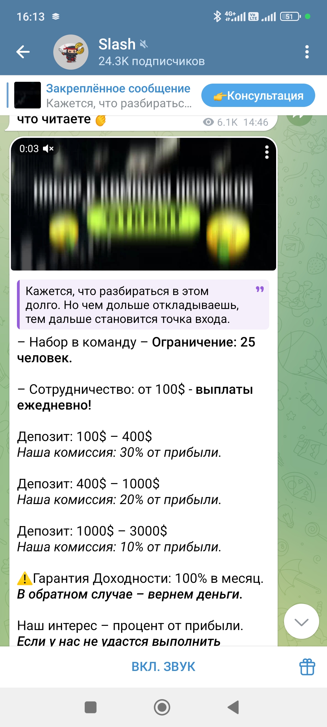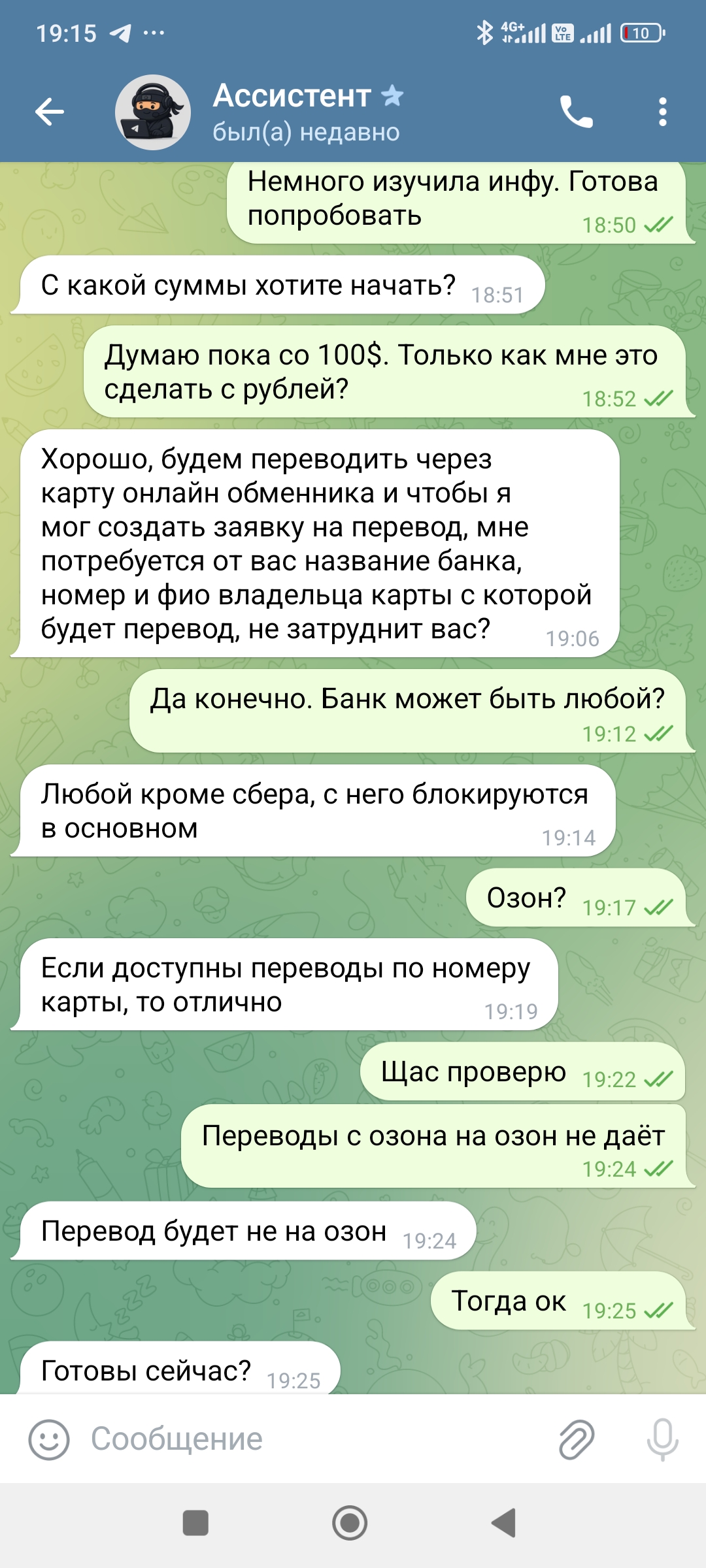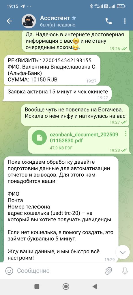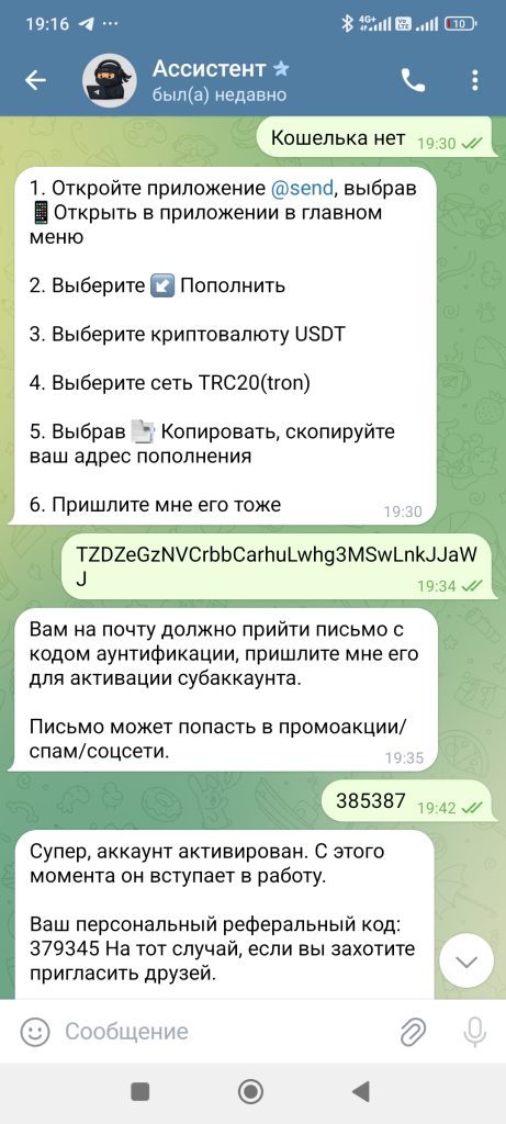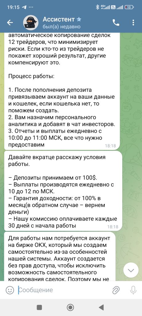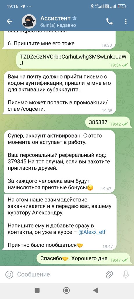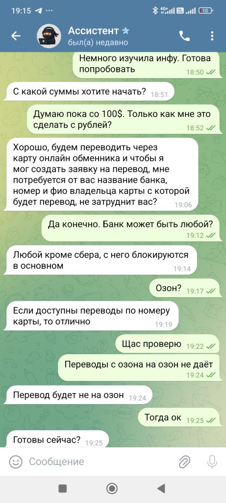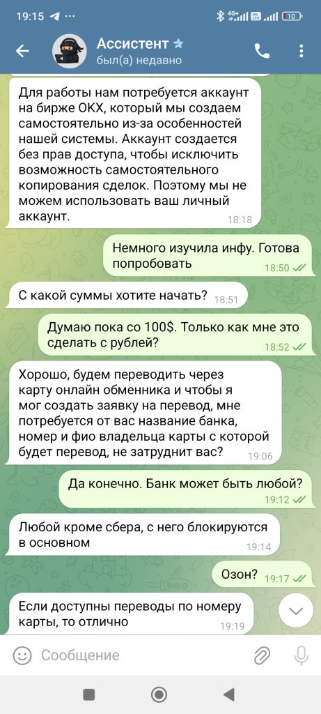 Кликнула на консультацию, деньги не большие, решила рискнуть. Мне помогли завести кошелек, положить туда деньги и купить крипту, дальше пришел небольшой заработок, второй день снова+ на счете. Третий день+. Дали даже вывести 5 долларов. И все, птичка в клетке). Мне стыдно(. Появился шанс хорошо вложиться, на максимум ума хватило не пойти, вложила минимум. И о чудо, через два дня огромный плюс10. Но вот беда , чтоб их вывести, нужна страховка 300usd. Так хорошо утро начиналось) . Параллельно добавили в группу из 26 человек, в которой новички Ангелина и мне подобные, а так же акулы своего дела, общавшиеся на непонятном языке. В личном переписка с куратором, который всегда подскажет. По сути все делала сама, деньги на кошелек, покупка крипты, отправка на мою биржу, к которой у меня понятно дело не было доступа, чтоб я без них не обогатилась. Обидно что я взрослый лох)))