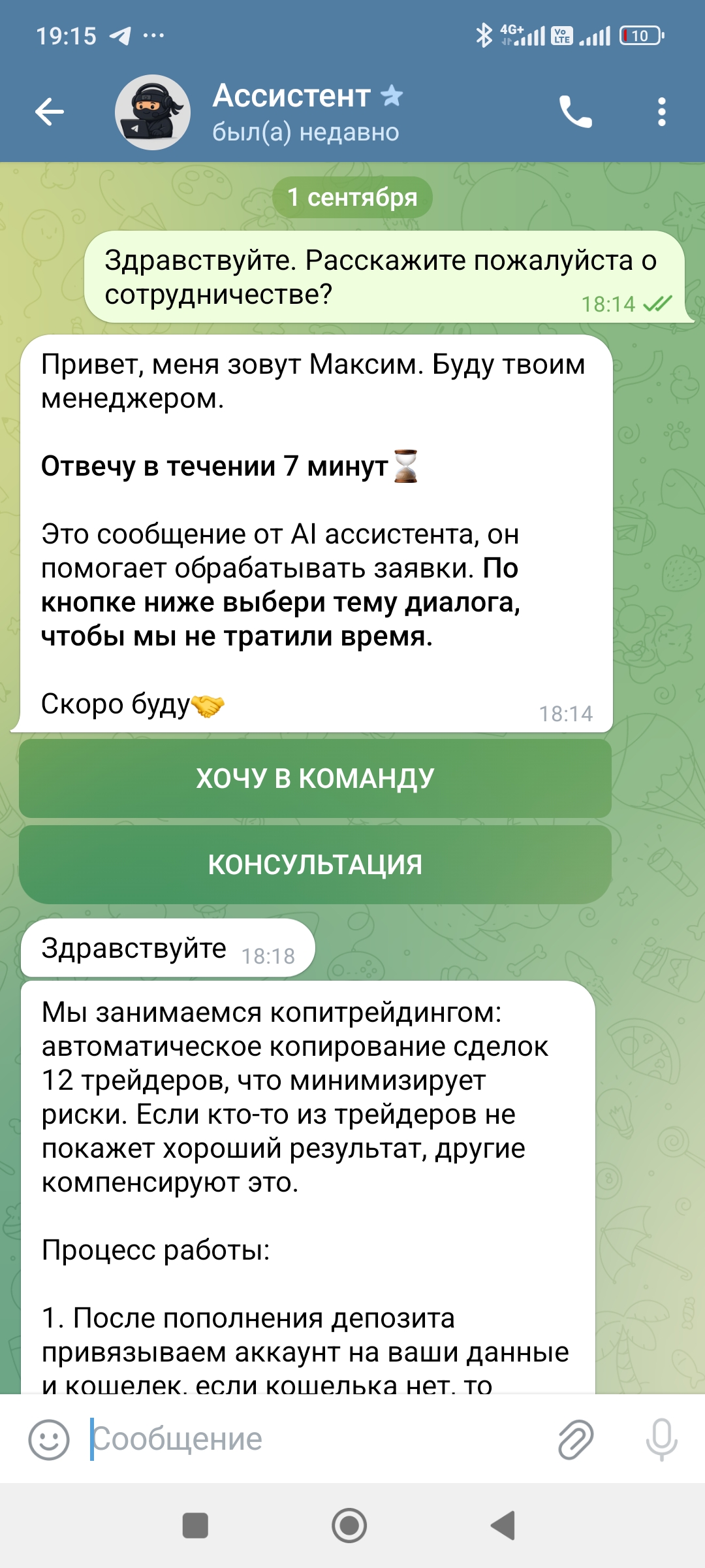 Наткнулась на якобы трейдера, Кирилл. Со своей прекрасной командой. Даже в интернете про него статья, мол ребята работают добросовестно, да берут много но того стоит.