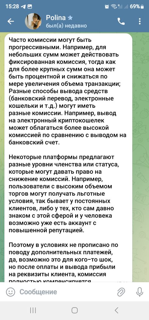 Я тоже, к большому своему сожалению, попалась на эту АФЕРИТСТКУ!!! перевела ей 83 тысячи рублей. Я человек очень осторожный, но тут действительно была психологическая атака уговорами и втиранием в доверее с её стороны. Отправляла свой паспорт( поддельный), скрины переписки клиента, который тоже «якобы был недоверчив», голосовые с обещаниями отправить все вложенные и прибыльные средства по её личной гарантии обратно (в случае неудачи) , а по итогу все больше и больше сумы высылала для пополнения её счетов. Очень жалко потерянные средства! Думаю, что все равно таким воровством человек богаче не станет, больше потеряет — своим здоровьем и здоровьем своих детей, личным счастьем, уже не раз была такому свидетелем. Время все расставит по своим местам. Все получают свои уроки, я получила со своей доверчивостью