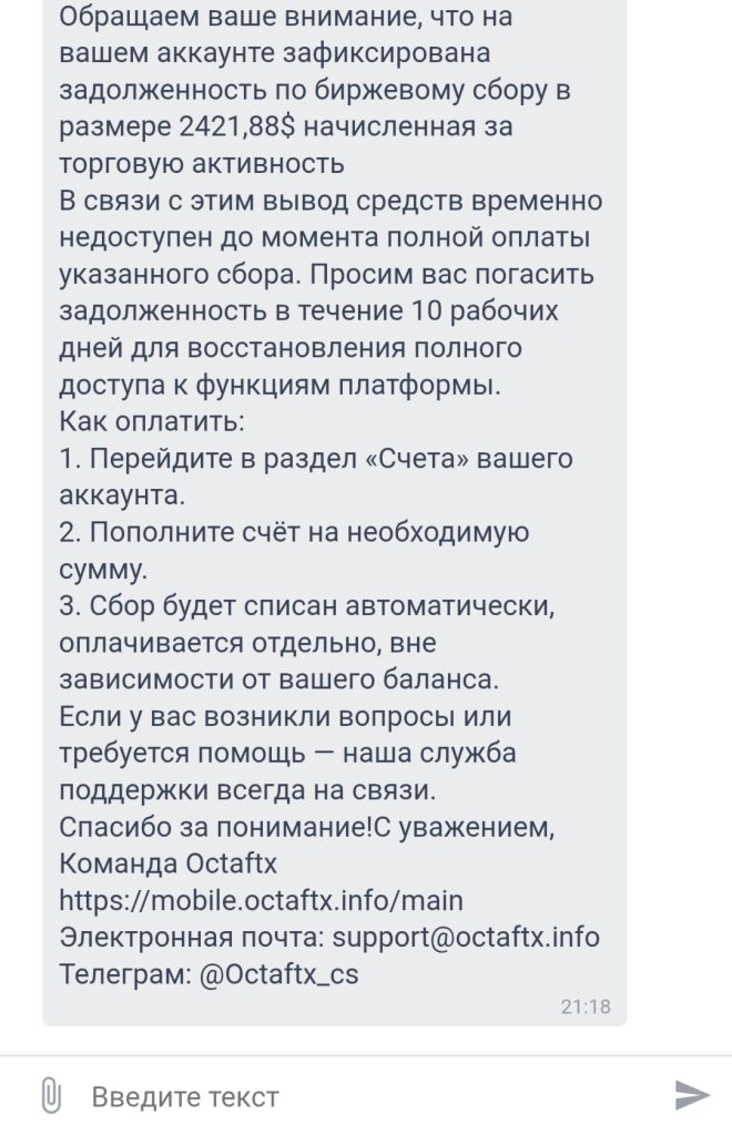 http://mobile.octaftx.info, предложили вложится для заработка, якобы заработала. Деньги вывести не получается