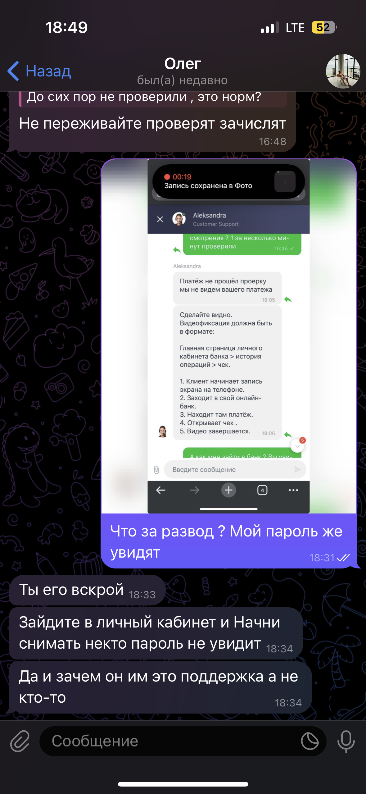 первая проверка заключается в том что вы переводите на сайте 2000 сразу же проходит проверка и второй этап это 3 500 тоже перевод на карту конечно же проверка очень сильно затягивается вы не можете вывести свои деньги после чего техподдержка просит вас снять свой экран как вы заходите в личный кабинет .подтвердить перевод ну то есть показать именно чек в видео то есть отдельно чека и недостаточно когда сдаешь вопросы этому Олегу скинула проверку он говорит да все в порядке ничего страшного в этом нету можете не показывать свой пинкод и никто его не увидит вам я побоялась это делать снимать свой личный кабинет в общем сообщаю мошенника
