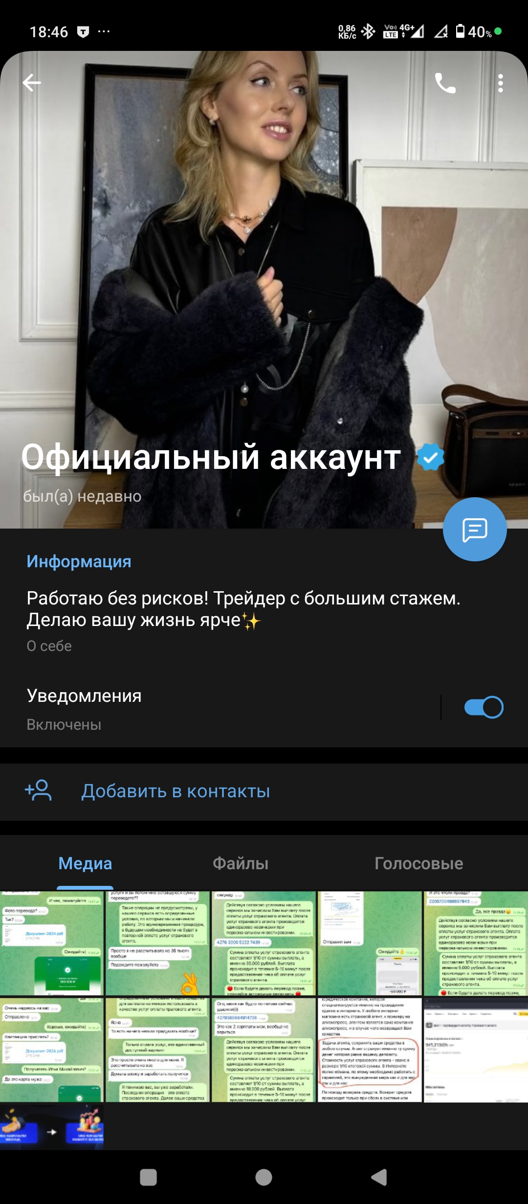 Наткнулся на её канал в рекламе, перешёл, написано инвестиции от 500р, выплаты на следующий день, чтобы проверить я скинул 500р, сегодня написала мне что выплата 50к, готова, но перед тем как её получить, нужно платить страховое агентство, 5к, и сказала после оплаты деньги придут спустя 5-10 минут, я уже начал что-то подозревать, решил найти её фотки в интернете, написано что это Ольга Якобчук, российская актриса. и т.д.