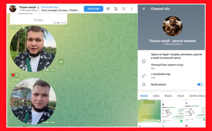 Пример: канал «Пошел на*уй — деньги важнее» с описанием «Здесь не будет продаж, рекламы, курсов и всей остальной хуеты. Личный блог крипто-отца»