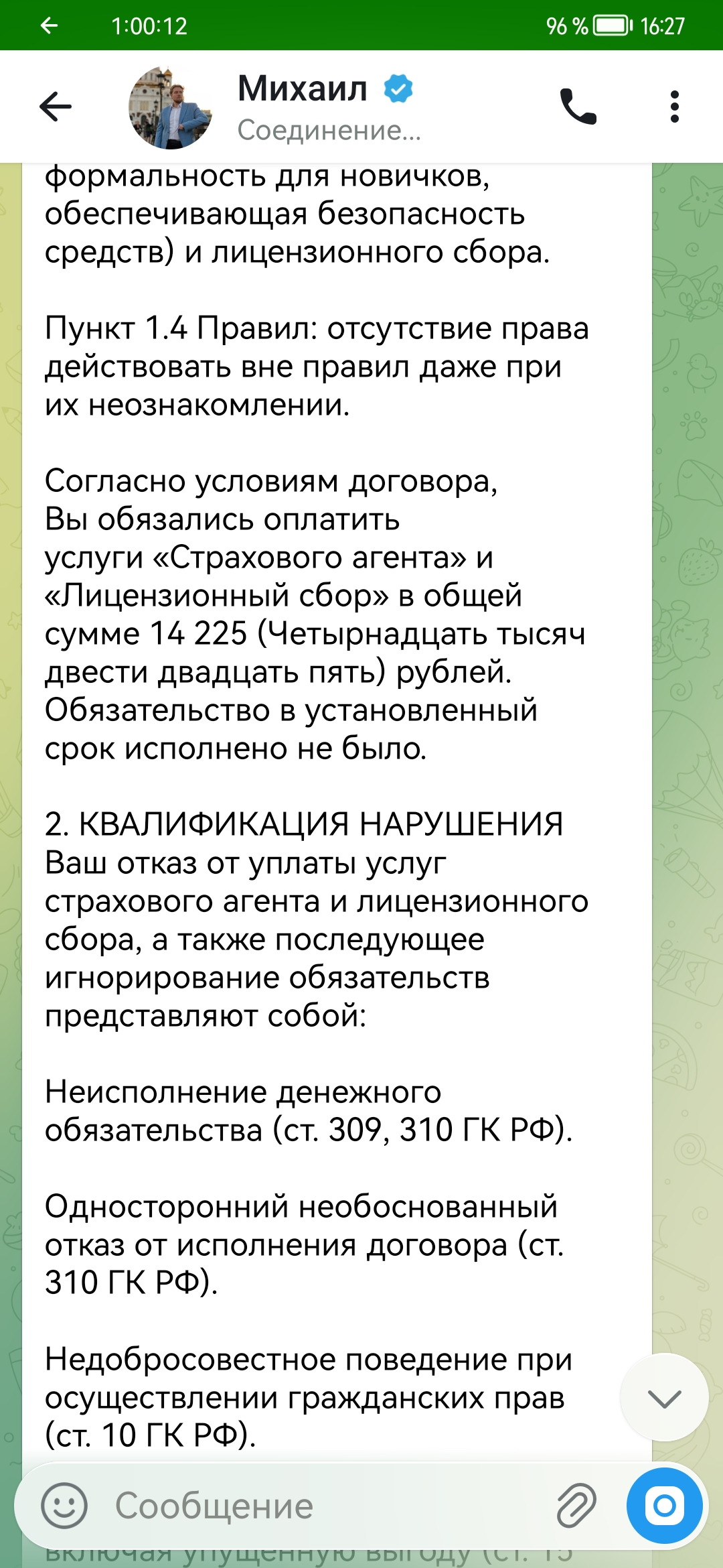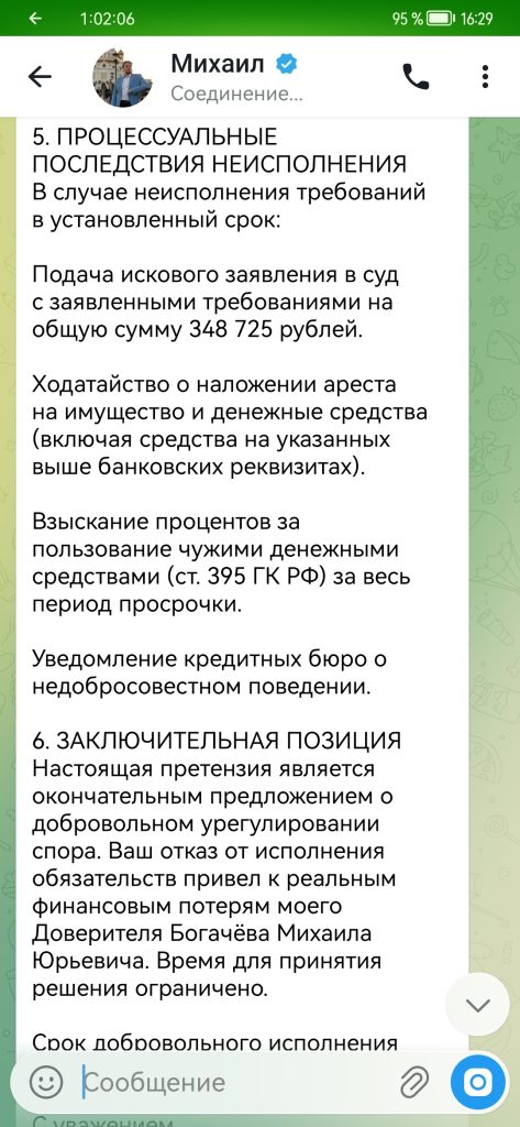 Под предложением помощи в инвестировании Михаил угрозами обращения в суд и составлением претензии на вкладчика депозита вымогает деньги. Могу предоставить запись с экрана диалога с Михаилом Богачевым, который запугиваниями пытается добиться перевода денежных средств от вкладчика.