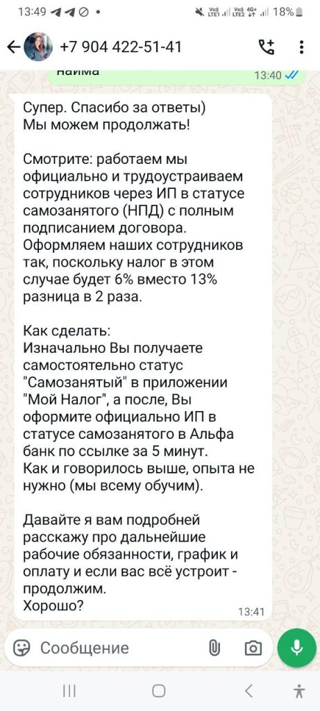 Смотрите: работаем мы официально и трудоустраиваем сотрудников через ИП в статусе самозанятого (НПД) с полным подписанием договора. Оформляем наших сотрудников так, поскольку налог в этом случае будет 6% вместо 13% разница в 2 раза. Как сделать: Изначально Вы получаете самостоятельно статус "Самозанятый" в приложении "Мой Налог", а после, Вы оформите официально ИП в статусе самозанятого в Альфа банк по ссылке за 5 минут. Как и говорилось выше, опыта не нужно (мы всему обучим). Давайте я вам подробней расскажу про дальнейшие рабочие обязанности, график и оплату и если вас всё устроит продолжим.