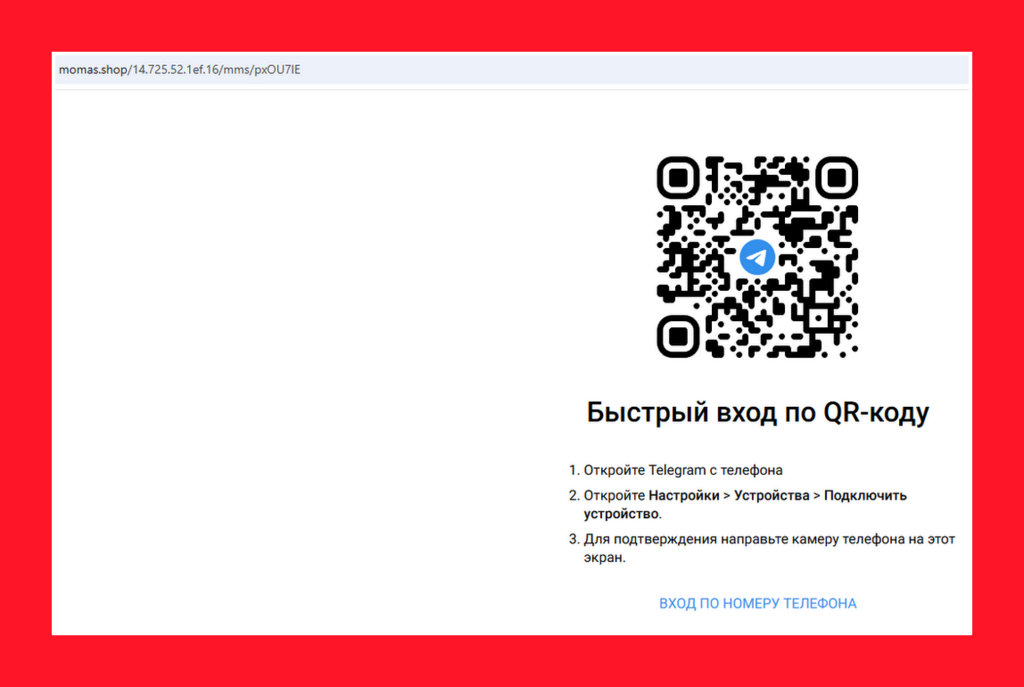 Идёт переход на сайт мошенников momas.shop/14.725.52.1ef.16, где предлагают приложением ТГ сканировать QR-код с целью угнать телеграм-аккаунт.