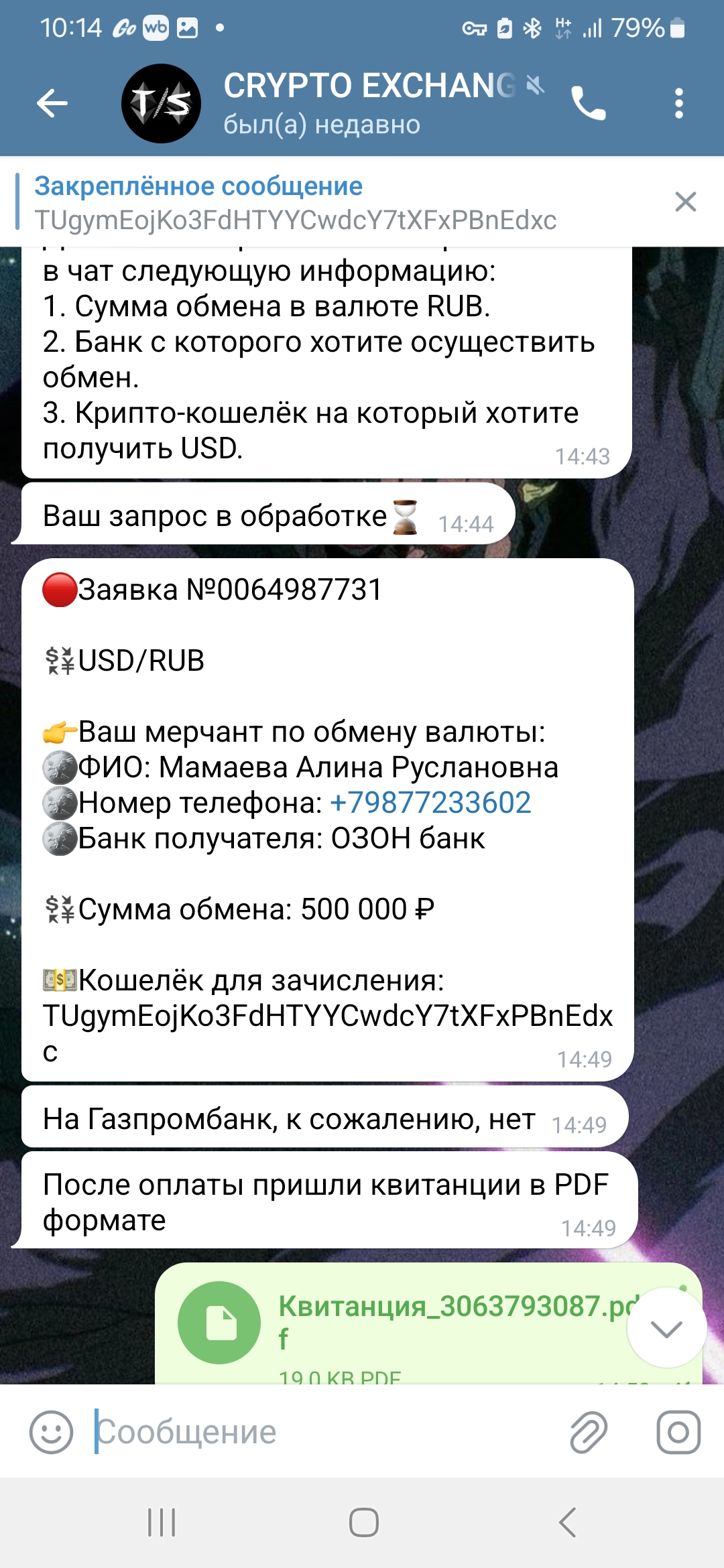 На сайте ко мне через Telegram обратился пользователь с предложением о покупке Telegram‑канала. Мы договорились, и я согласилась использовать сторонний сервис для перевода денег. В течение трёх дней я пыталась перевести средства, но каждый раз вывод отменялся с указанной причиной «верификация». От меня неоднократно требовали дополнительно положить деньги на сервис для прохождения этой самой «верификации». Поддержка сервиса (сотрудница Анастасия) вела себя грубо и ссылалась на внутренние правила, без объяснений и законных оснований блокировок/отказов.