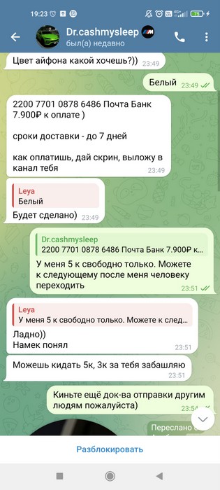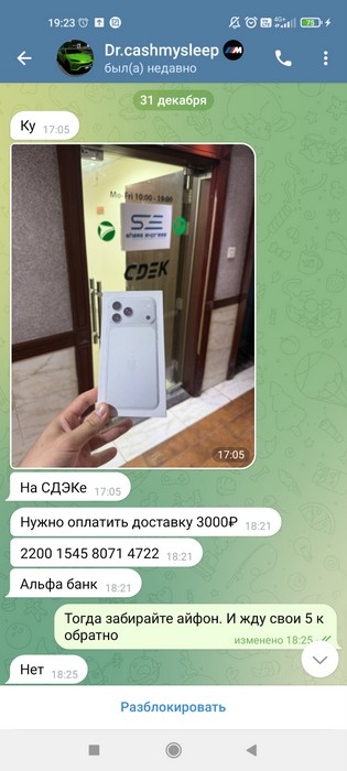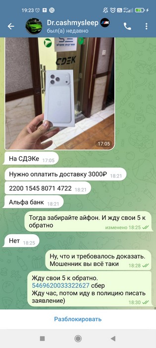 Здравствуйте, меня обманул на деньги 5000 к @drcashmysleep, его группа https://t.me/cashmysleep1. У меня есть скриншоты переписки с ним и на данный момент она всё ещё существует