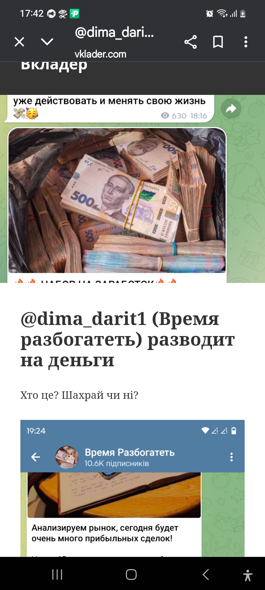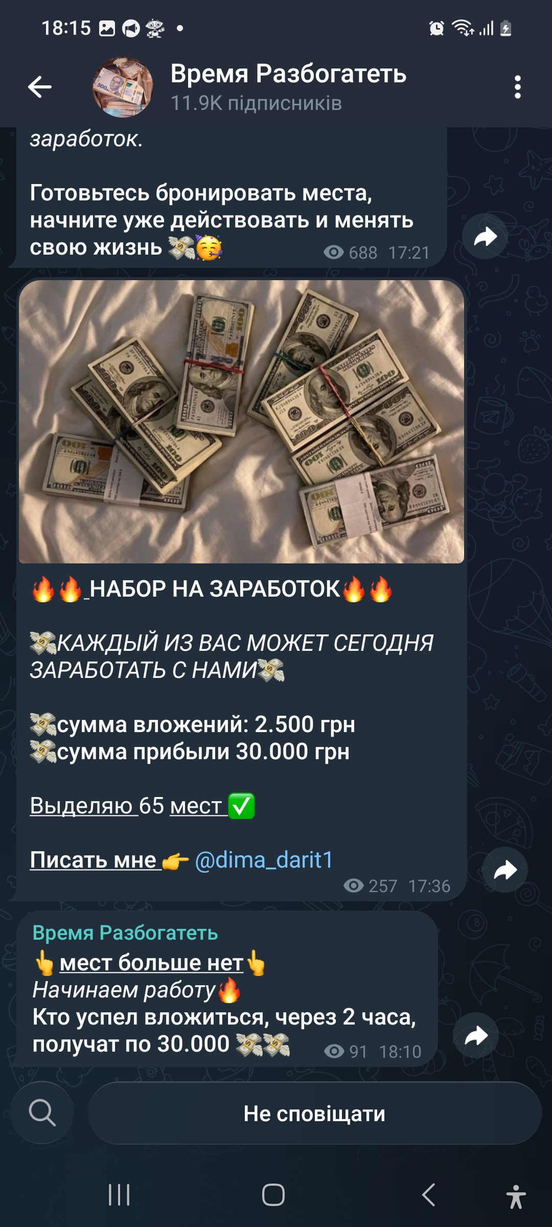 2) Мошенник ,,не доверяйте ,,обман и развод на деньги на канале телеграмм схема обмана ..Инвестируйте в мой проект. Перечисляем сумму, просят оплатить налог и процент и вас блокируют, отнимают у вас денежки.