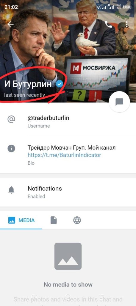 Теперь канал называется «Индикатор Батурина — трейдер Мовчан груп», адрес канала изменился на @BaturinTrade, контакт админа изменился на @traderbaturin. Также жулик изменил аватарку и подтёр часть старых постов, впрочем, не все, и во многих старых публикациях на его канале Батурин теперь мирно соседствует с Бутурлиным.