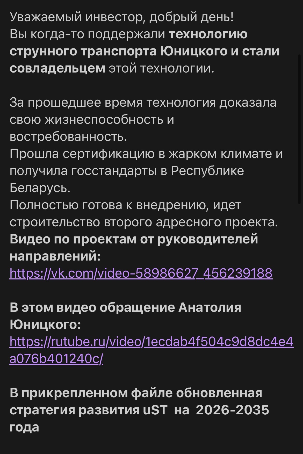 « Более 10 лет поддерживаю создание безопасного экологичного транспорта Юницкого. И сейчас, когда начались первые заказы, когда идет строительство второго коммерческого проекта, компании катастрофически не хватает средств на операционную деятельность и на выплату зарплат.