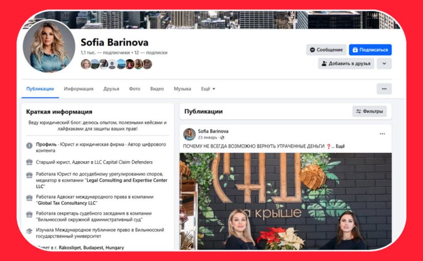 В тексте дана ссылка на выдуманный профиль «Бариновой» в ФБ и на сайт лжеюристов: