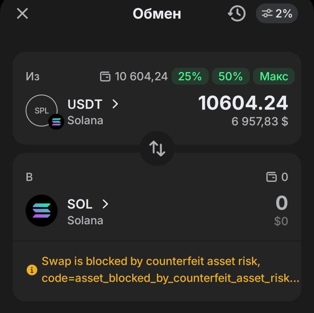 По сообщению Trust Wallet “Swap is blocked by counterfeit asset risk” почти всегда речь о поддельном токене-двойнике, который называется “USDT”, но не является официальным USDT (SPL) и обычно не имеет ликвидности — поэтому кошелёк и блокирует обмен.