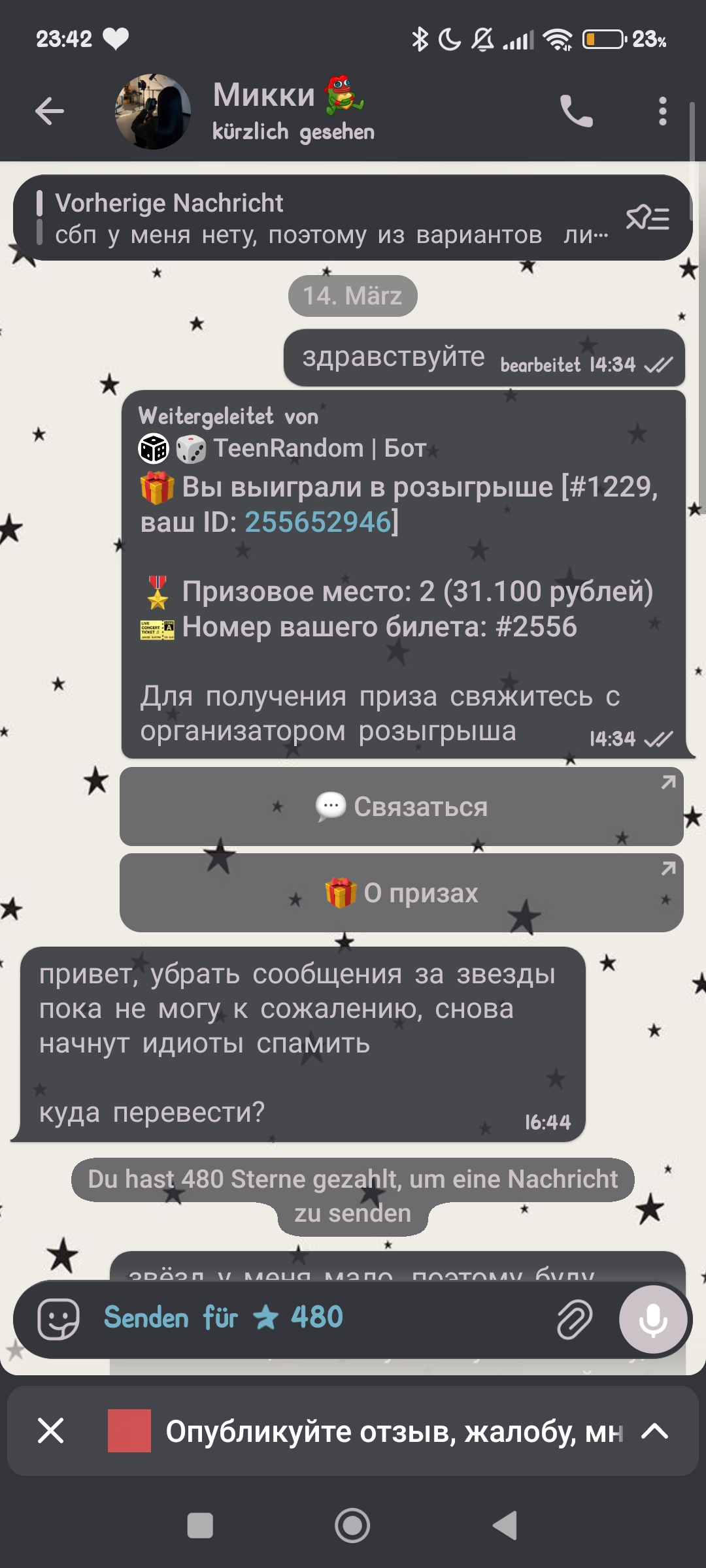 Прикрепляю скрины: чат с ботом, условия розыгрыша, переписка с ней.