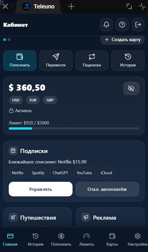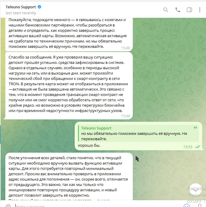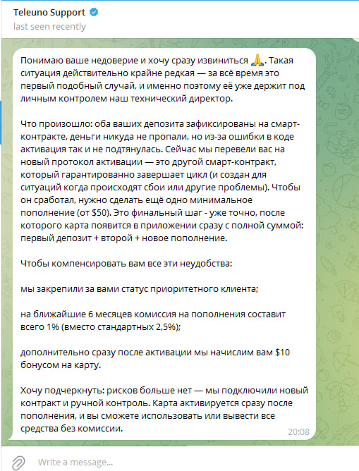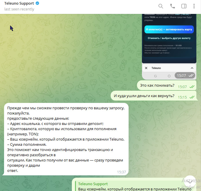 Телеграмм и сайт «Teleuno» предлагают виртуальные карты без верификации. Перевел им 20к на крипту. Кинули как последнего лоха.