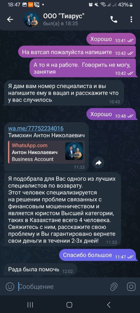 Я подобрала для Вас одного из лучших специалистов по возврату. Этот человек специализируется на решении проблем связанных с финансовым мошенничеством и является юристом Высшей категории, таких в Казахстане всего 4 человека. Свяжитесь с ним, расскажите свою проблему и Вы гарантировано вернете свои деньги в течении 2-3х дней!
