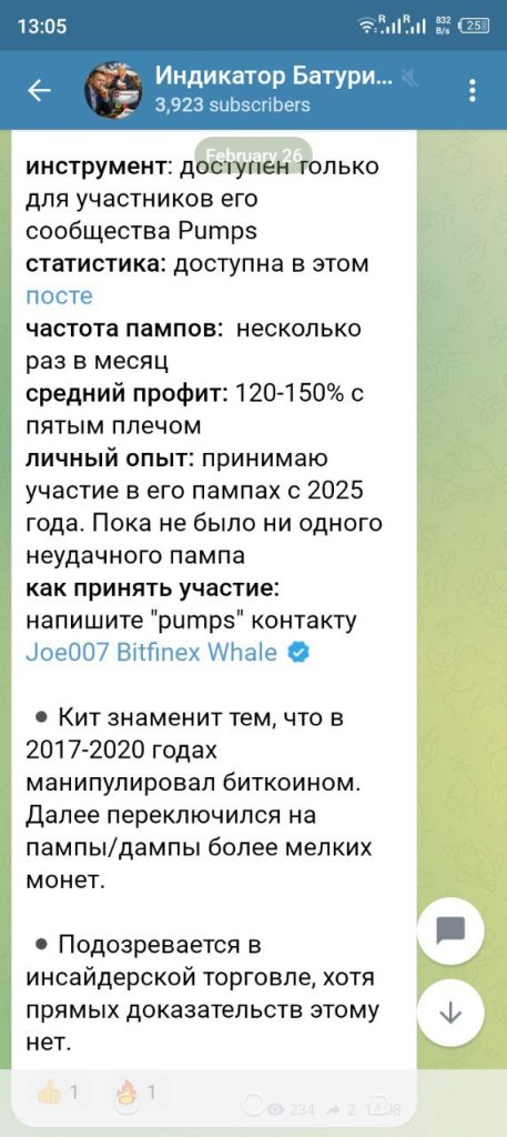 Весь расчёт мошенника строится на новых подписчиках, которые периодически приходят на канал с рекламы и которым ненавязчиво предлагают принимать участие в пампах крипты. Чтобы канал подольше не получал метку «скам», админ делает вид, что это не он проводит пампы, а под видом личной рекомендации отправляет людей на специально созданный англоязычный канал-прокладку @Joe007BitfinexWhale.