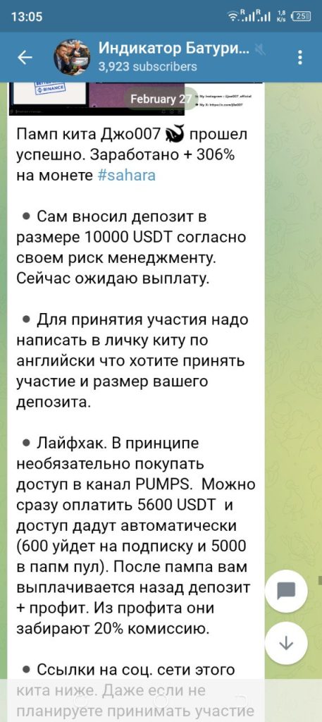 На том канале людям предлагают купить платную подписку за 600$, которая даст возможность участвовать в пампах, внося депозит от 5000$ и получая доходность 100-300% годовых с каждого пампа. Естественно, внесённые средства никто не вернёт, наивные люди будут просто обмануты и заблокированы.