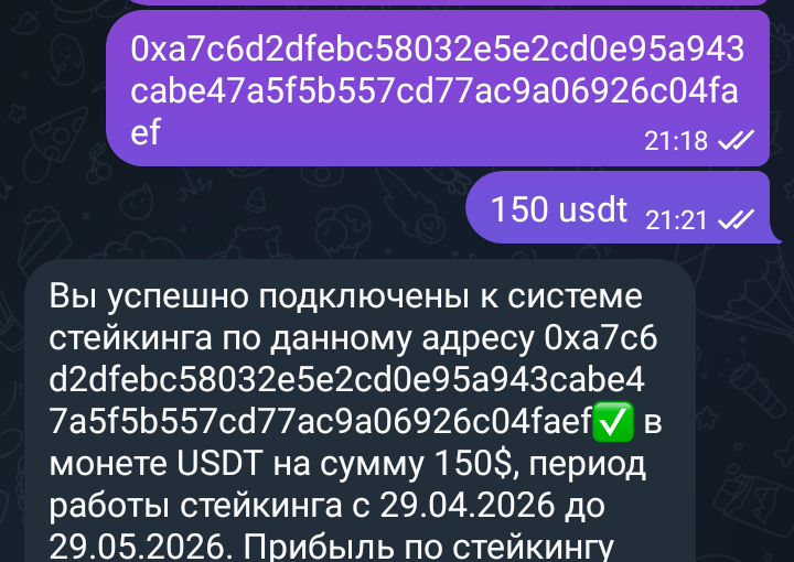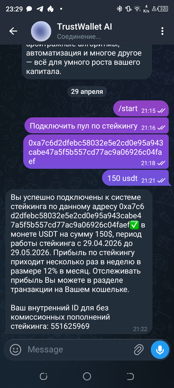 «Внутренний ID для бескомиссионных пополнений» — ещё один признак не блокчейн-стейкинга, а внутренней «кассы» мошенников. Настоящему стейкингу в кошельке не нужен ID в Telegram/МАХ.