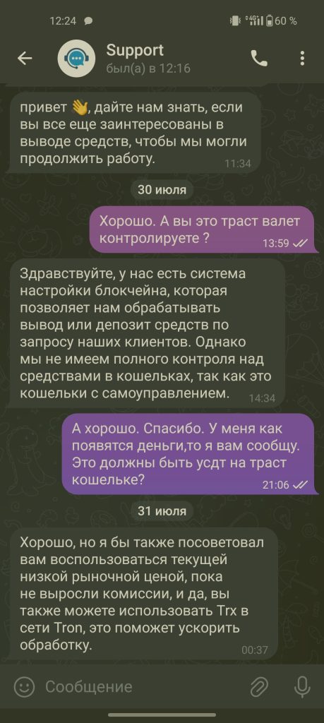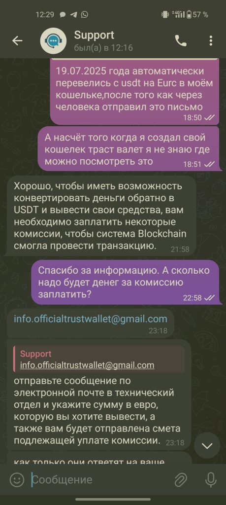 У настоящего Trust Wallet нет русскоязычной поддержки в Telegram, это тоже мошенники, как и support@trustwallet.click.