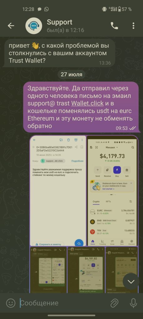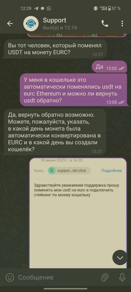 Я решил найти в интернете службу траст кошелька и со мной связался support, на фото видно переписку. Напишите, пожалуйста, возможно вывести или обменять эти eurc на usdt? Спасибо