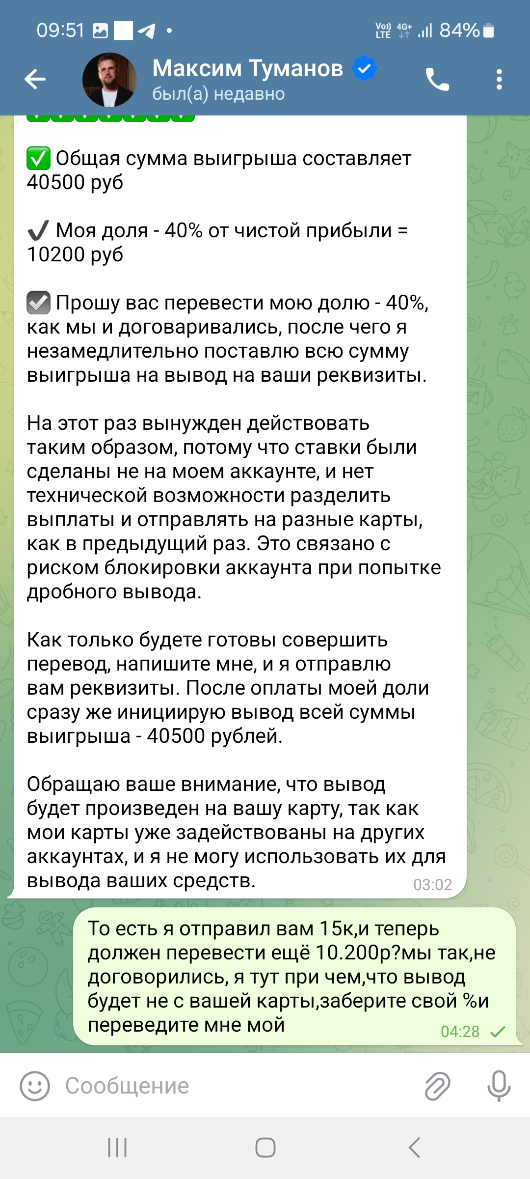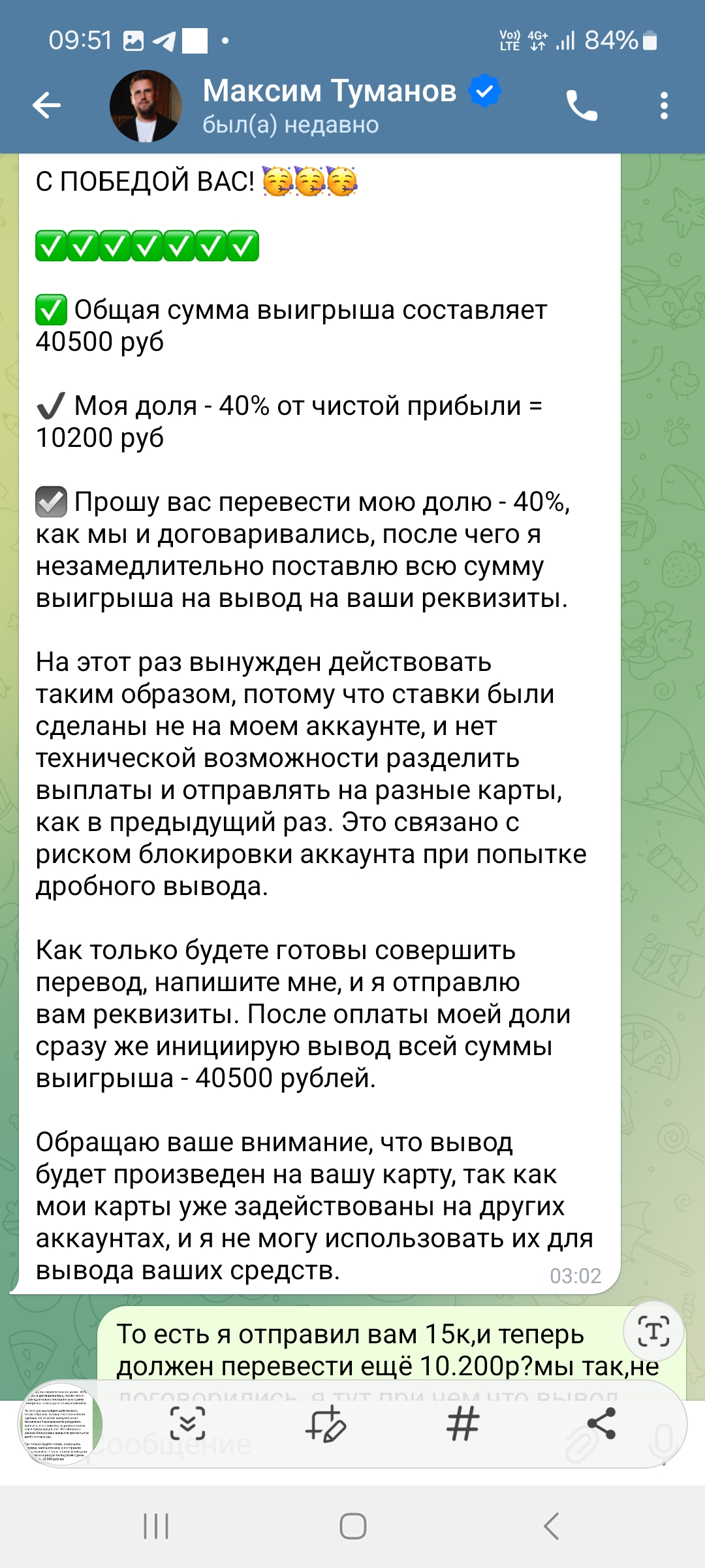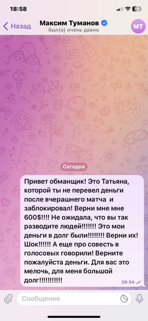 2) Максим сообщил, что будет договорной матч и убедил многих в своем телеграмм канале https://t.me/bet3232tuman что на этом можно заработать! Я перевела ему 63$ на Bybit для первого матча. Коэффициент выигрыша должен был быть 2,55 и его 40% от выигрыша. После первого матча я не забрала прибыль, а добавила еще 200$ на второй матч. После пройденного второго матча он со своего телеграмма @tumanovbet уточнил, буду ли еще добавлять деньги или забираю выигрыш. Я сказала, что забираю. После этого чат был удален и он меня заблокировал!!! У меня был шок. Я написала ему пару ласковых со второго тг. Он прочитал и тоже заблокировал. Он в своих голосовых призывал людей брать долги, кредиты, деньги отложенные на операции и без риска вкладывать в эти матчи! Бессердечный жестокий лживый мошенник без грамма совести! Люди, не ведитесь на него пожалуйста. Он мошенник, хотя пока смотришь его телеграмм канал, это даже не подозреваешь…. Жалобы на его смс в тг канале результаты не принесли… я думала, он выборочно выбрал людей , кому не выплатил. Но почитала статью здесь (жаль что поздно) и поняла, что он обманул многих а может и всех! Будьте осторожны