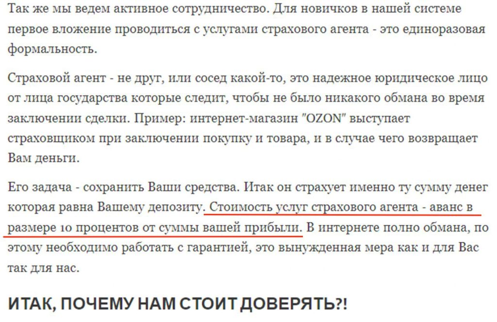 Стандартная схема — вложи мало, получи нереальные горы. Но чтобы эти «горы» капнули тебе на счет, необходимо оплатить 10% от выигрыша страховому агенту.