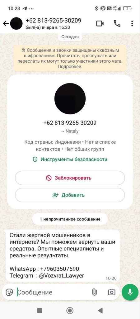 Мошенники пишут в WhatsApp с номера +62 813-9265-30209 (код страны — Индонезия). Контакт подписан как Nataly.