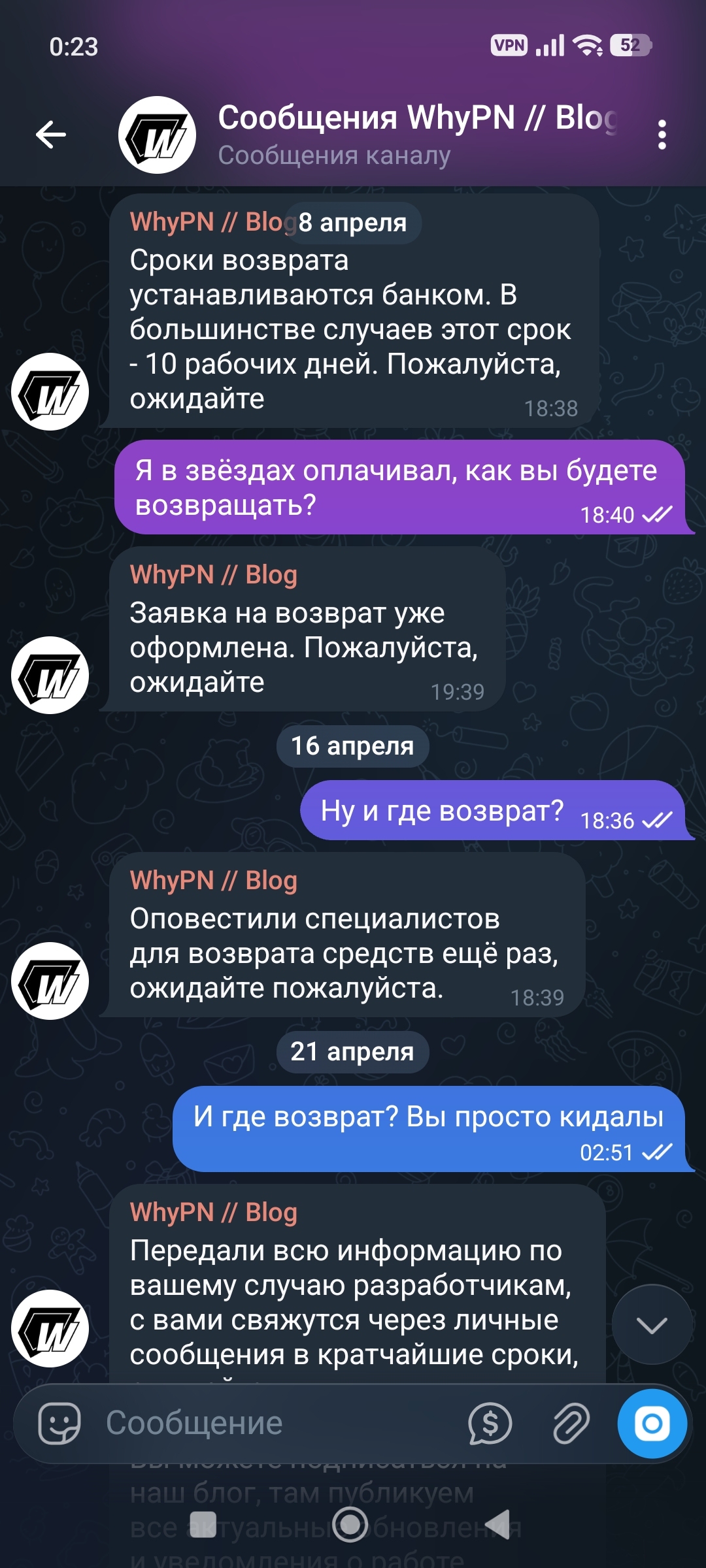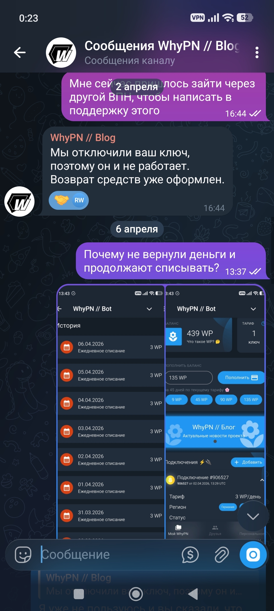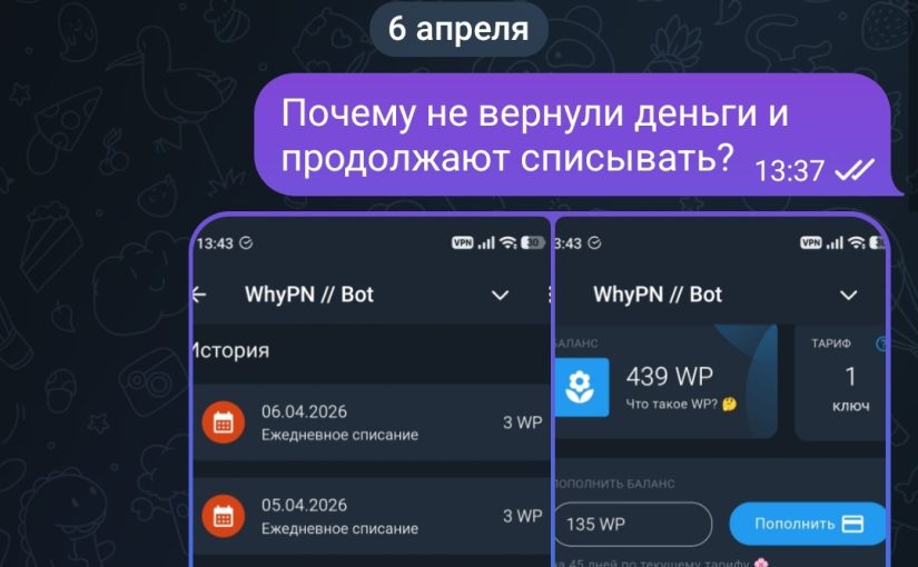 @whypnbot WhyPN и их владелец специально вначале дают более менее серверы, а когда оплачиваешь или пополняешь баланс с запасом, то переводят на серверы с пингом 3000-5000 мс и скоростью меньше 1-2 мбит/сек, которые к тому же постоянно отваливаются. Там большая переписка, сначала я просил сменить серваки, но это не помогло, потом запросил возврат средств и они просто кормят завтраками, деньги не вернули.