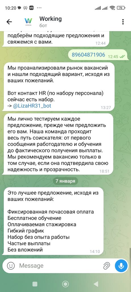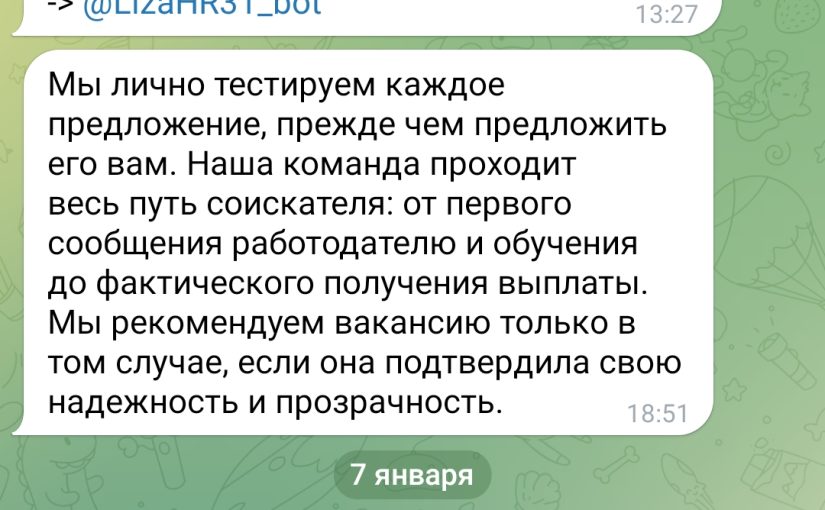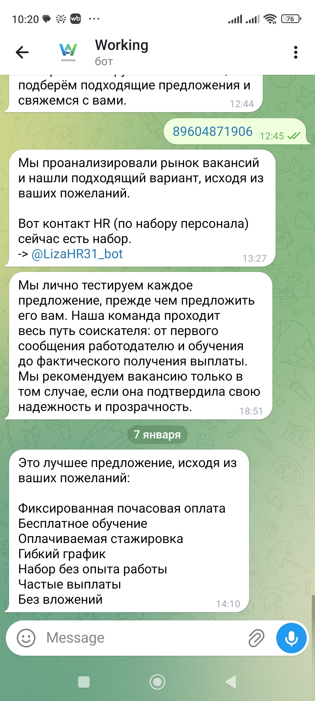 Добрый день, есть канал с ботом (working) который направляет к @LizaHR31_bot набирают людей а после проведенных работ не выплачивают, кидают. Не рекомендую тратить свое время, ни мне ни моей знакомой не заплатили блокируют
