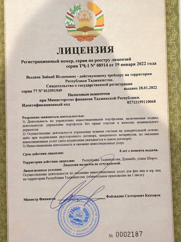 Граждан Таджикистана обманывает «Усманова Зайнаб Исламовна», предъявляя такую «лицензию», в которой в спешке забыта фамилия «трейдера на территории Республики Таджикистан». Кроме того, сказано, что лицензия действует только на улице Шероз в Душанбе.