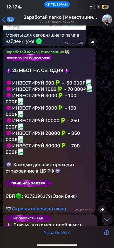 я поверила,написала что хочу внести 500 рублей,меня приняли сказали на следующий день утром скинут мне 50 тысяч если все успешно пройдет,в итоге сказали все прошло успешно скидывайте номер карты или телефона ,я скинула ,после этого они говорят что нужно внести 5 тысяч рублей,я сказала спишите с этой суммы 50 тысяч -5 тысяч,на что они сказали что не могут,кружок записать не смогли ,коменты закрыты в тгк сказали от украинцев