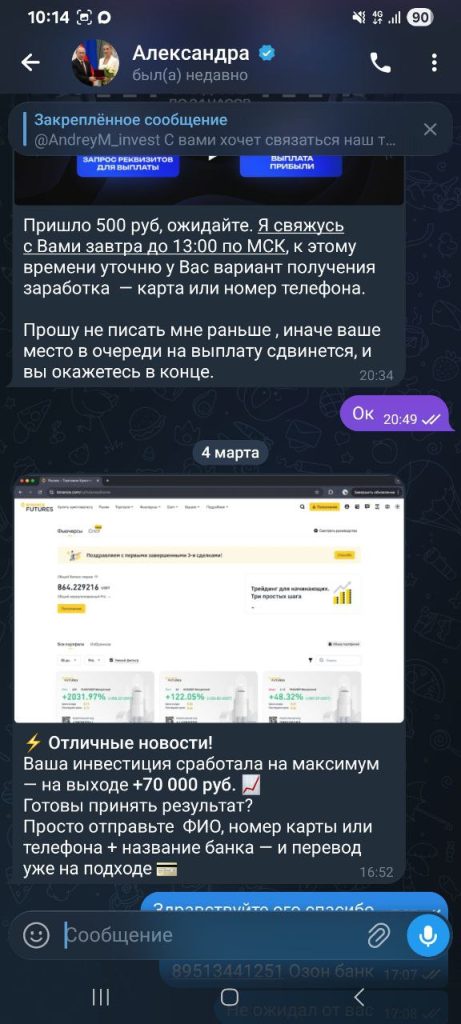 Дальше пришла главная приманка. Ему показали скриншот якобы успешной торговли и написали: «⚡ Отличные новости! Ваша инвестиция сработала на максимум — на выходе +70 000 руб. 📈 Готовы принять результат? Просто отправьте ФИО, номер карты или телефона + название банка — и перевод уже на подходе». То есть человеку сначала пообещали прибыль, а уже потом начали ставить условия для её получения. Это классический приём: сначала показать «выигрыш», потом превратить его получение в квест с оплатами.