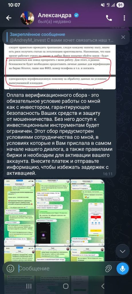 Следующий этап — навязывание так называемой «верификации». В переписке ему объяснили, что без дополнительного платежа доступ к деньгам невозможен: «Оплата верификационного сбора — это обязательное условие работы со мной как с инвестором, гарантирующее безопасность Ваших средств и защиту от мошенничества». Это особенно циничный момент: требование нового перевода подавалось именно как защита от мошенничества. Дальше давление усиливали псевдоюридическими формулировками: «Без него доступ к инвестиционным инструментам будет ограничен», «Внесите платёж и отправьте информацию, чтобы избежать задержек с активацией». На приложенном фрагменте текста жертву дополнительно запугивали: любые «попытки обойти закон» будут расценены как повод прекратить работу.