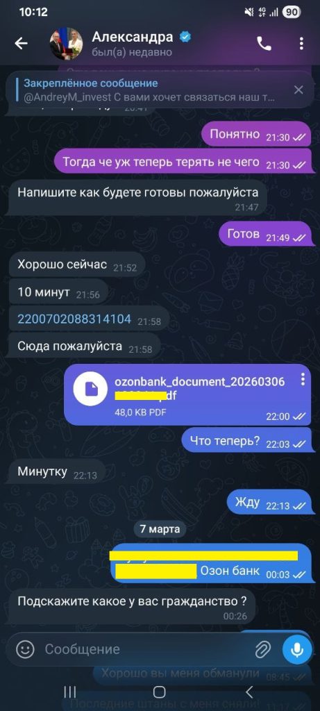 Когда он сообщил реквизиты и уточнил банк, собеседница стала управлять каждым шагом. Она спрашивала: «У вас озон банк?» Когда он ответил утвердительно, последовало: «Давайте лучше через озон». Затем, выдержав паузу, она прислала номер карты: «Сюда пожалуйста» и далее реквизиты. После перевода жертва фактически уже была психологически вовлечена: раз деньги отправлены, хотелось верить, что это не зря и что дальше «выплата» действительно придёт.