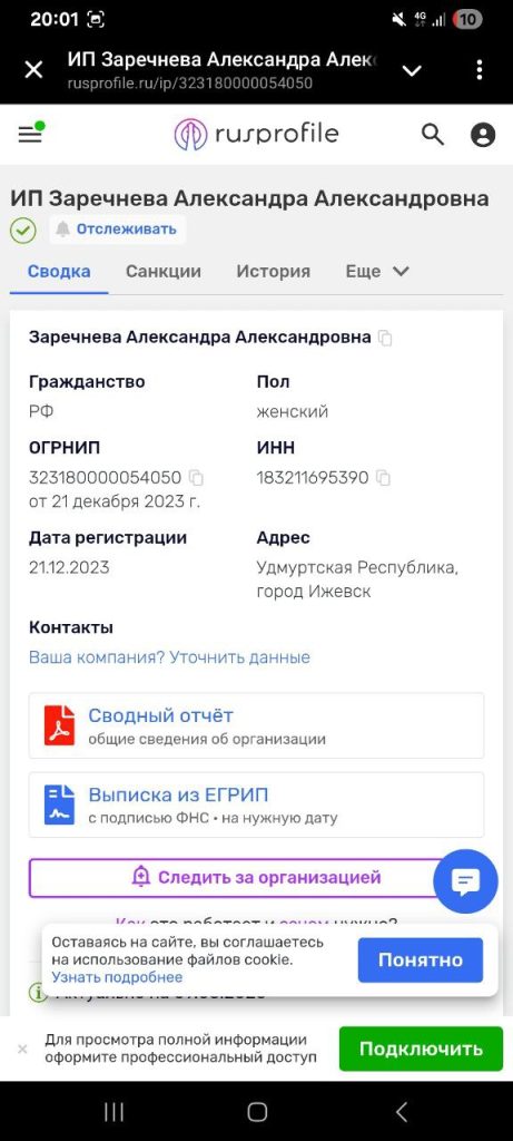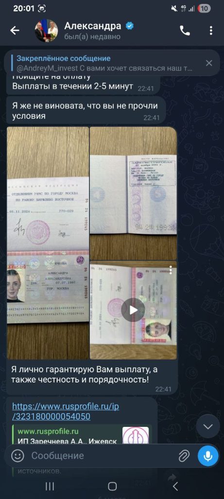Для усиления доверия использовались фотографии привлекательной молодой женщины, в том числе снимок в офисе и фото с вручением награды президентом Путиным в официальной обстановке. Позже в ход пошла и ссылка на чужое ИП в Rusprofile, а также изображения паспорта, чтобы у жертвы возникло ощущение: перед ним не анонимный мошенник, а «реальный» человек с документами и регистрацией.
