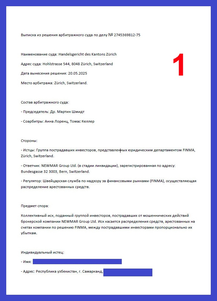 Коллективный иск, поданный группой инвесторов, пострадавших от мошеннических действий брокерской компании NEWMAR Group Ltd. Иск касается распределения средств, арестованных на счетах компании по решению FINMA, между пострадавшими инвесторами пропорционально их убыткам.